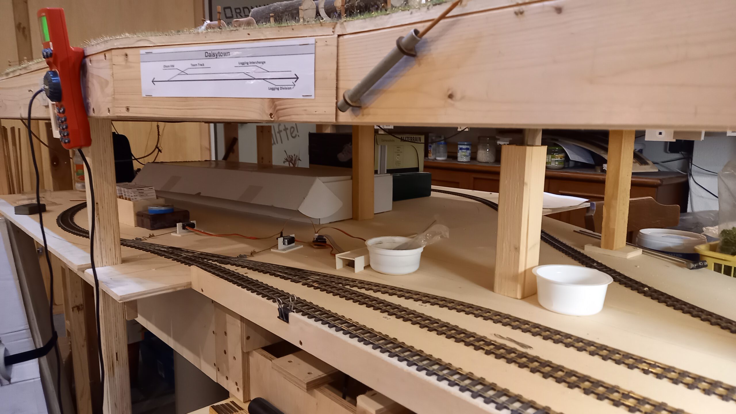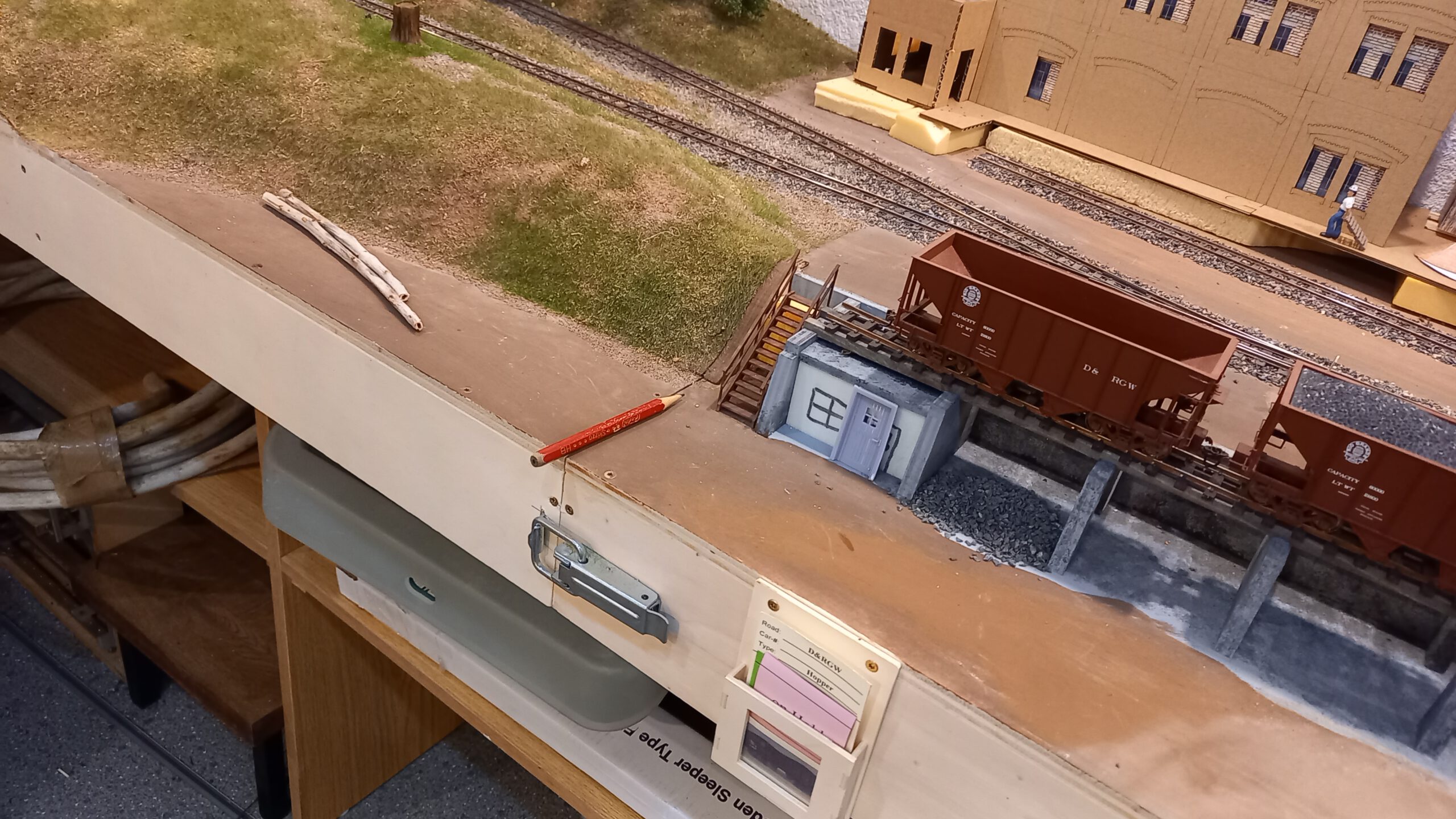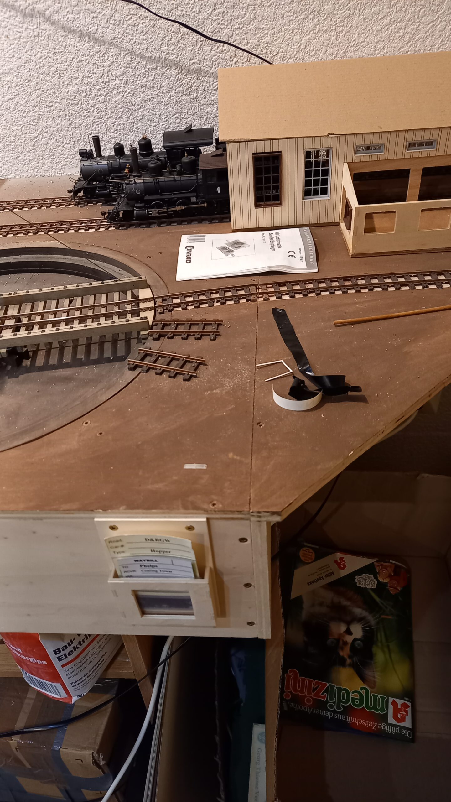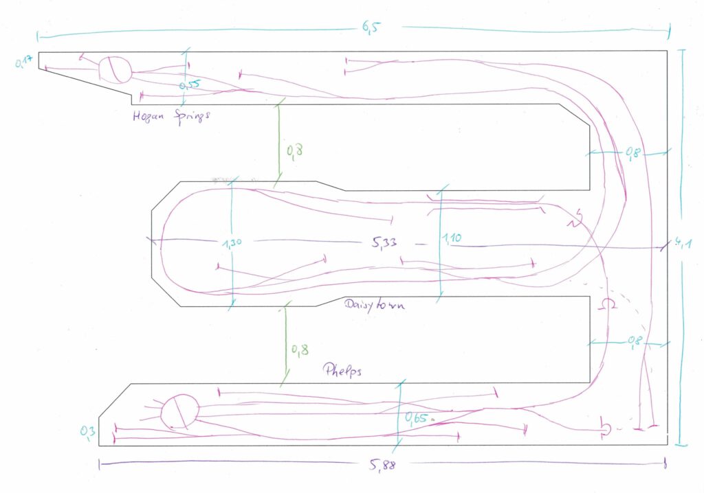 Hinweis – Daisytown ist auf zwei großen Segmentkästen aufgebaut und läßt sich ohne weitere zerlezen. Siehe die Trennstellen auf den letzten Bildern am roten Bleistift. Hinzu kommt noch die abgeschrägte Erweiterung um mehr Platz für den Lokschuppen zu haben.