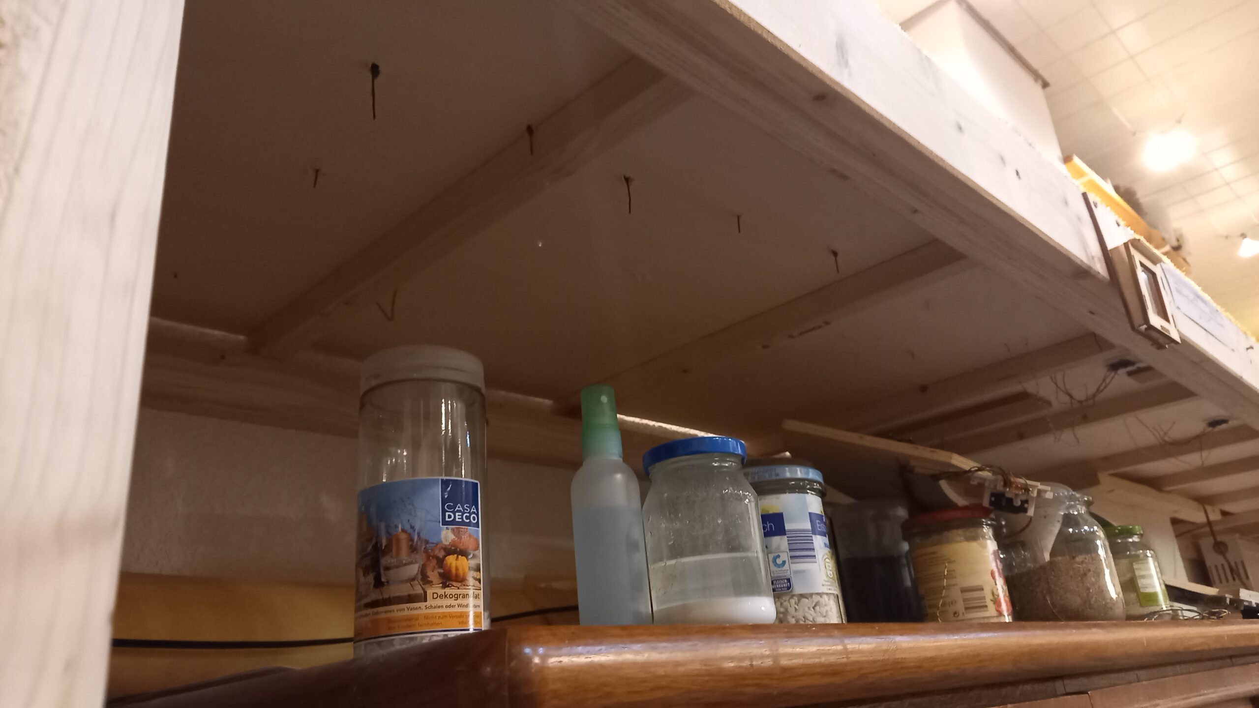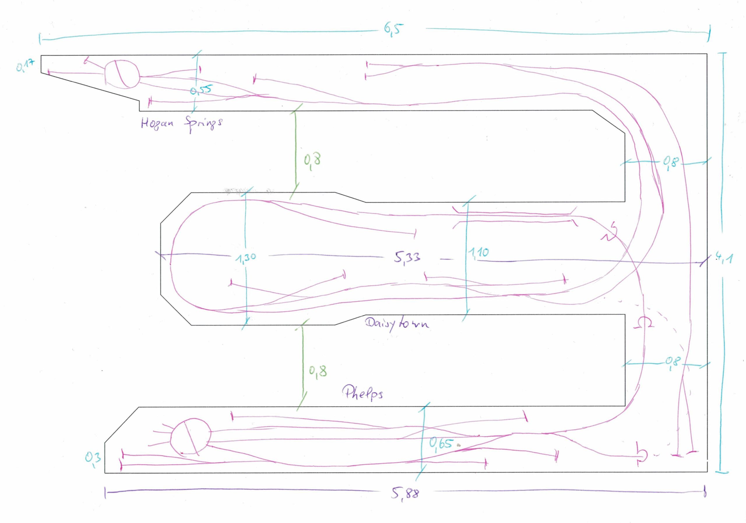Der Raum hat ca 6,4 x 4,1 Meter. Alle Maße in der Skizze sind in Metern angegeben. Der Gleisverlauf ist von HAnd eingezeichnet und nicht im Maßstab. Der Schattenbahnhof befindet sich in zweiter Ebene unterhalb von Daisytown.